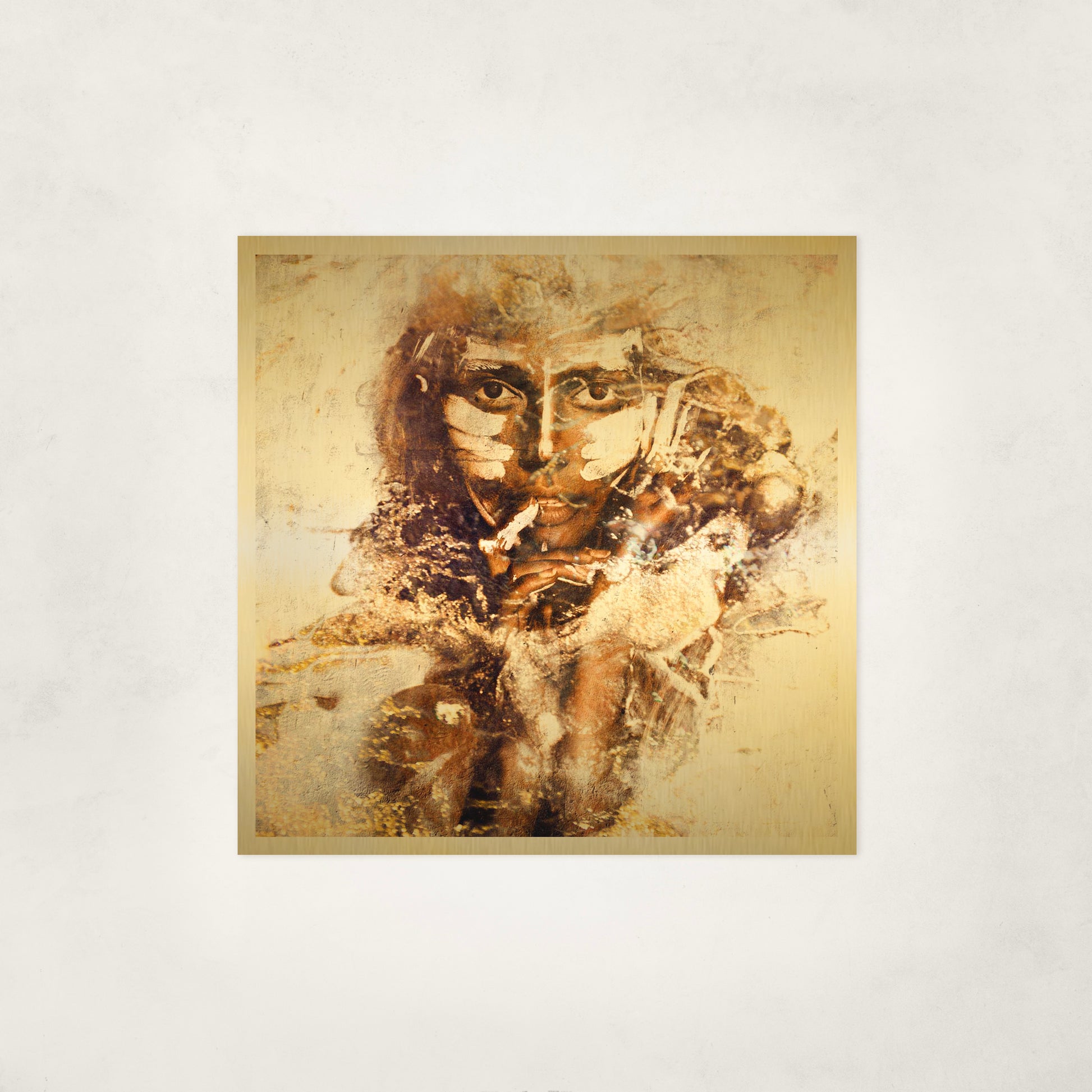 Printed on metal, the surface deepens and holds light, giving the figure presence and quiet authority.