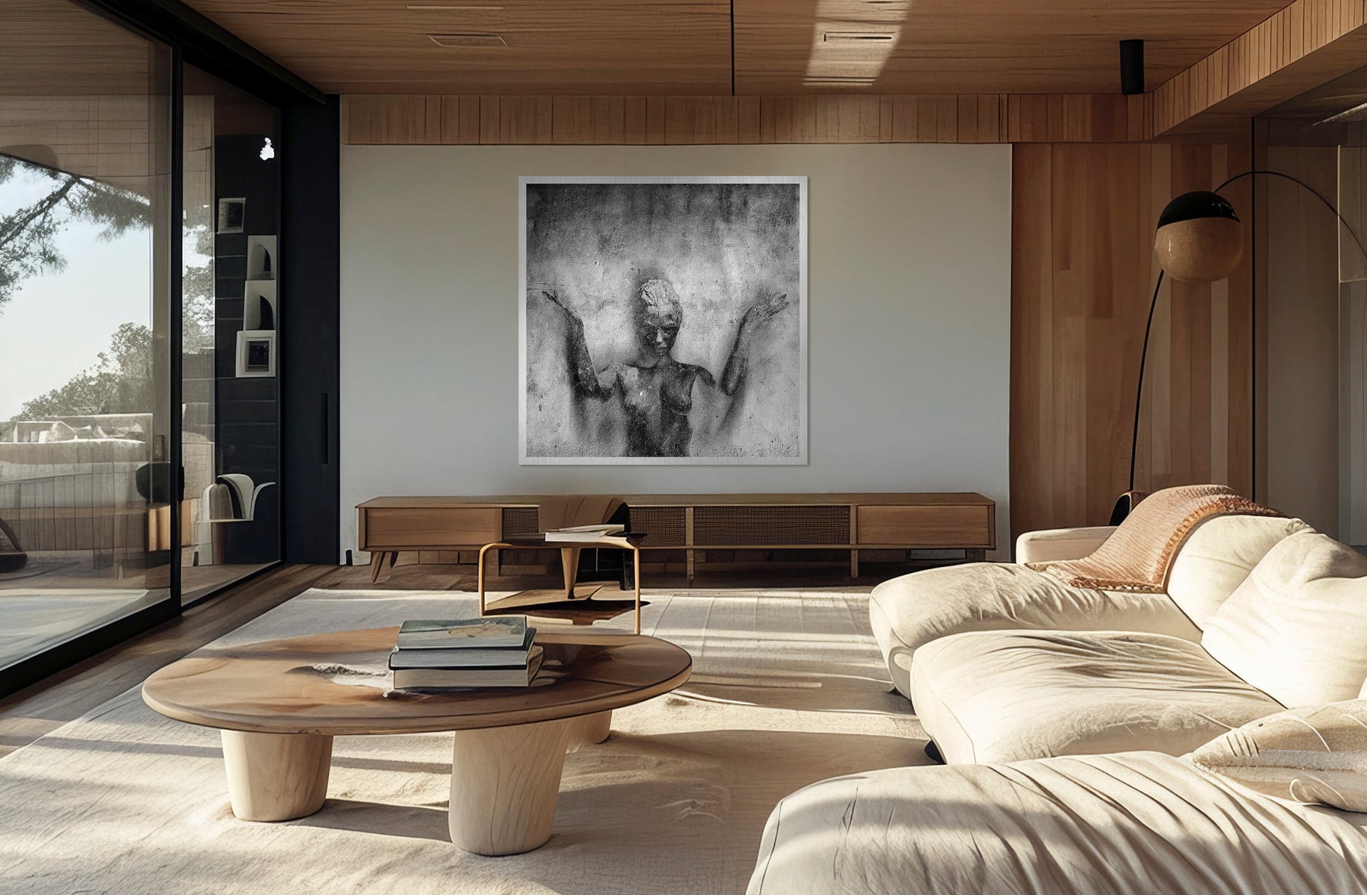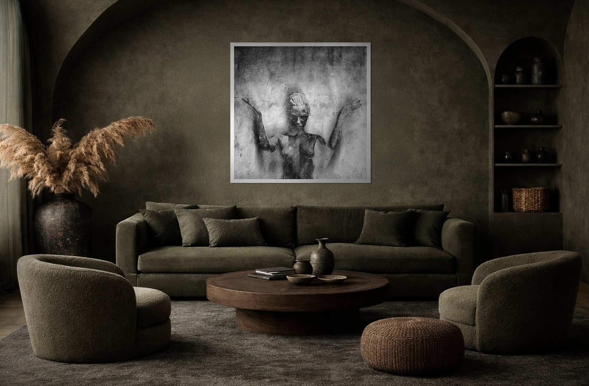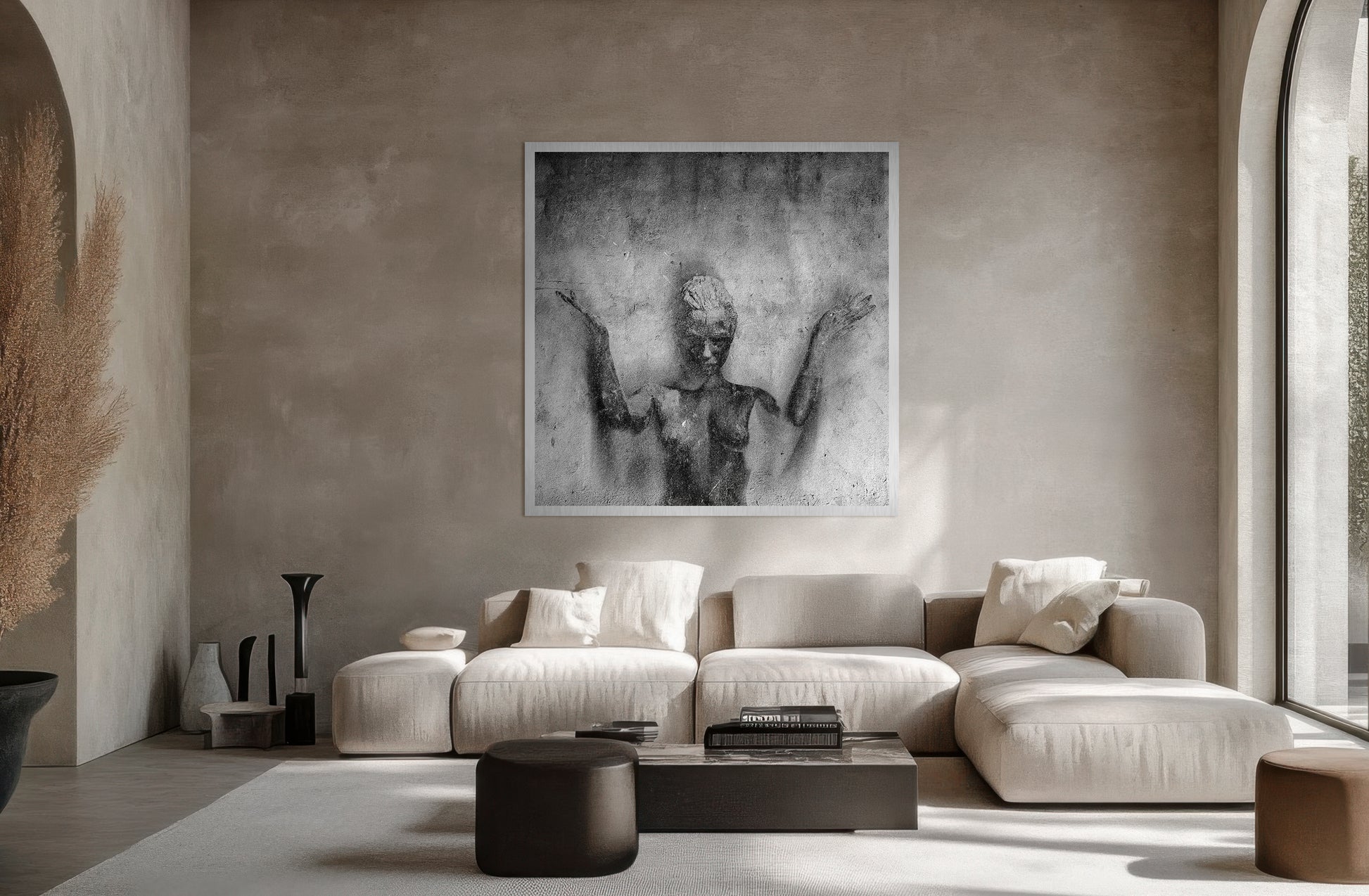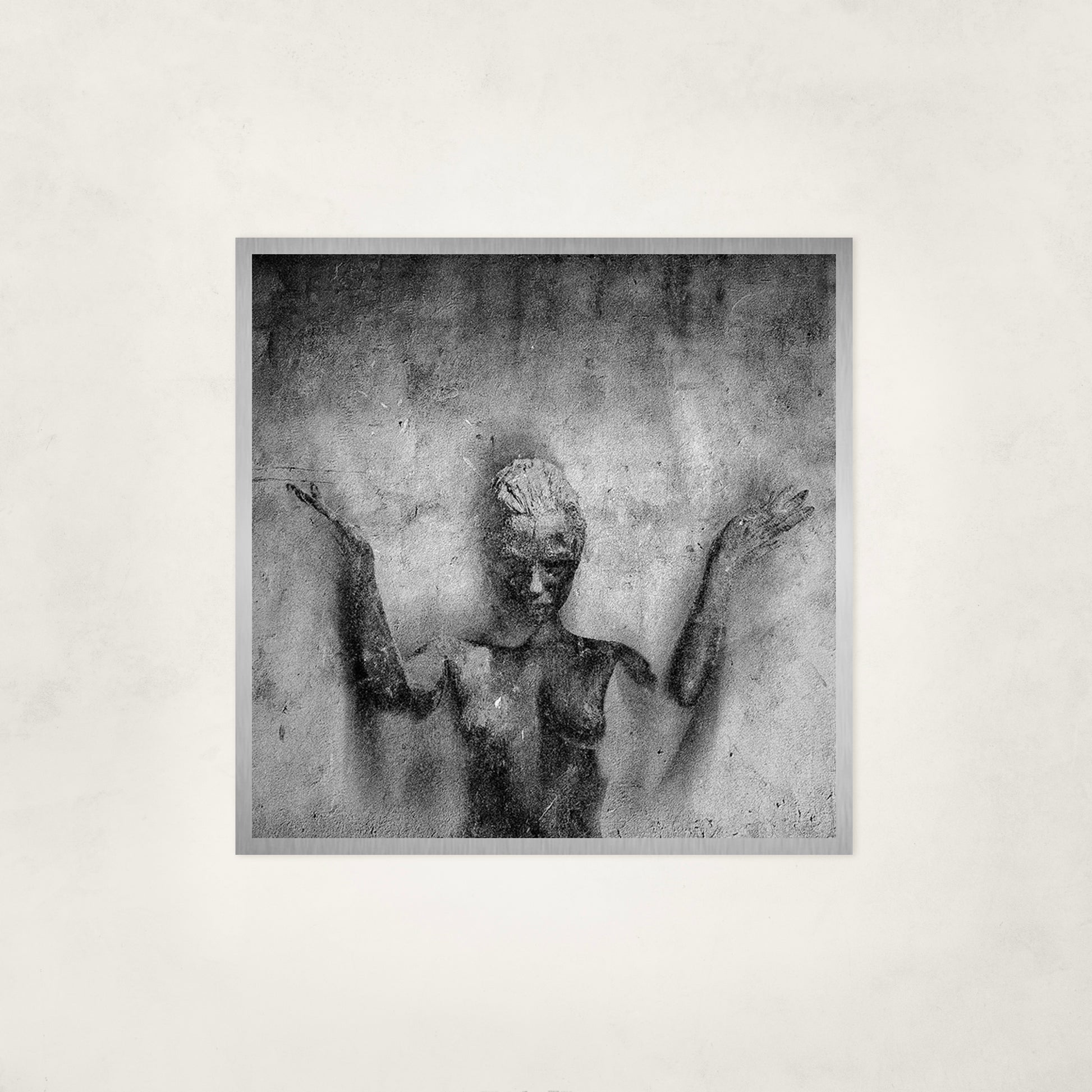 Printed on metal, the figure gains presence — poised, grounded, and enduring.