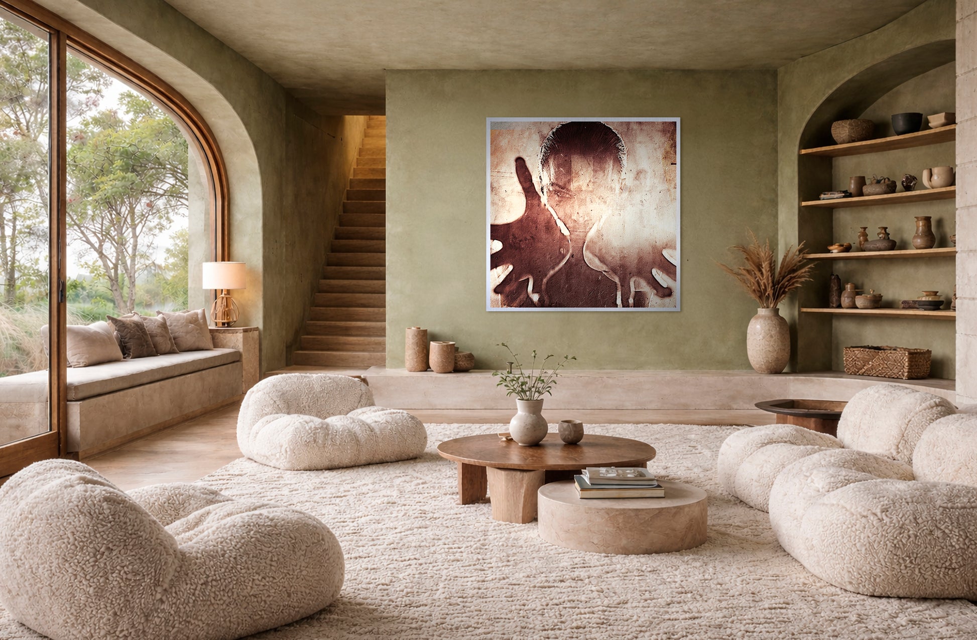 A concealed sub-frame is mounted on the back of the artwork, creating a floating effect approximately 20 mm from the wall.