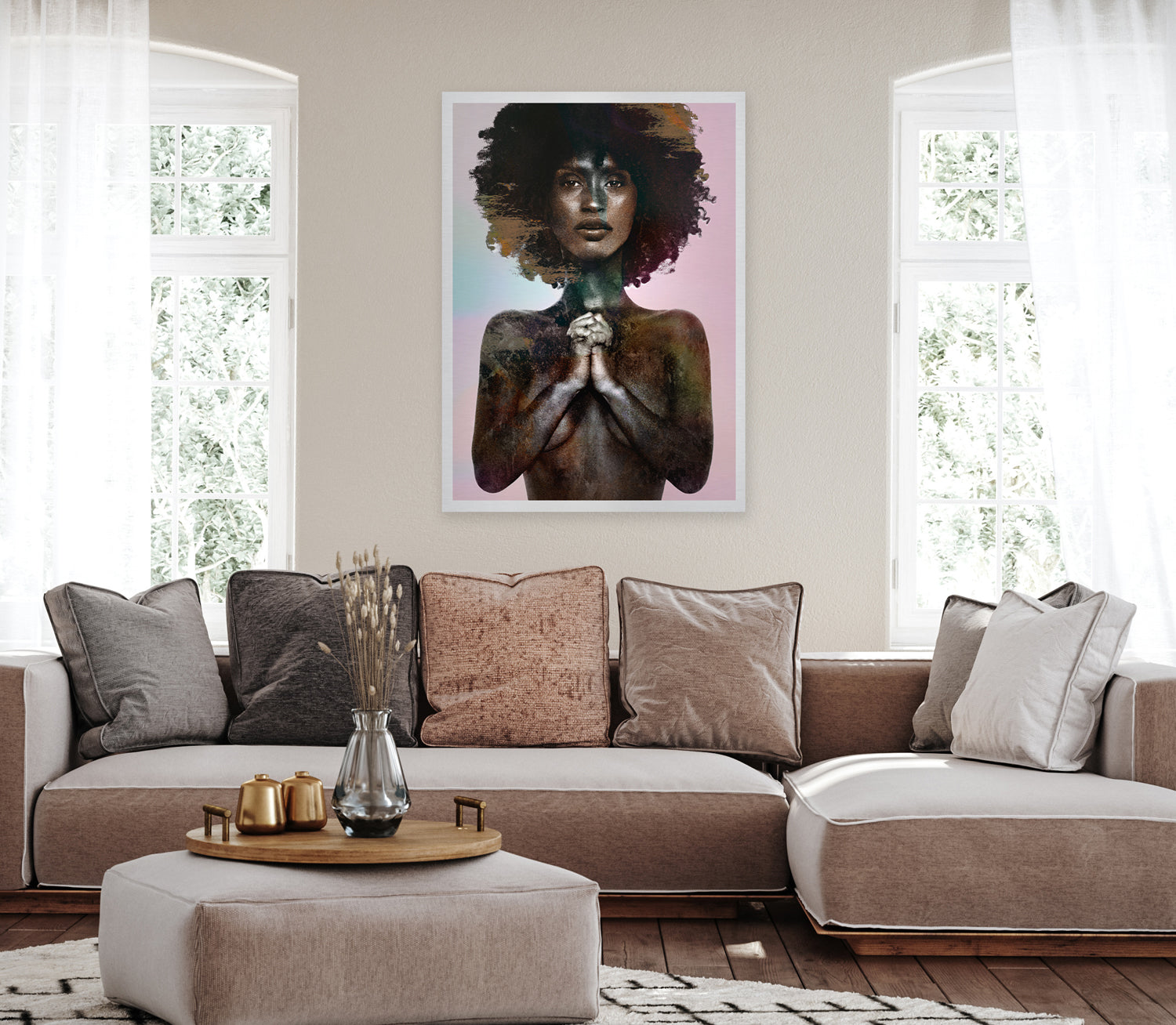 On the back of the art piece, we attach a sub-frame that makes it appear as if it’s floating 20 mm away from the wall.