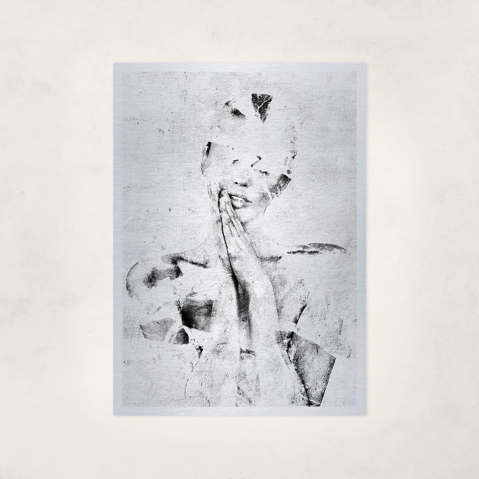 Printed on silver metal, the concrete textures sharpen and cool, giving the work a sculptural, architectural presence.