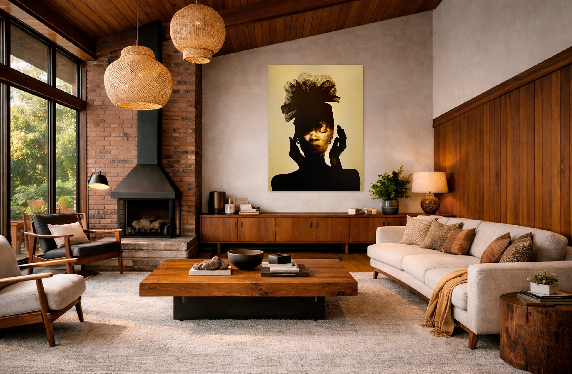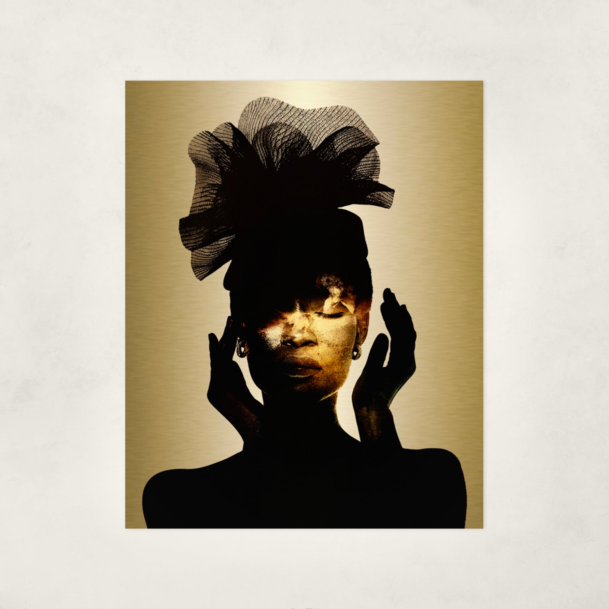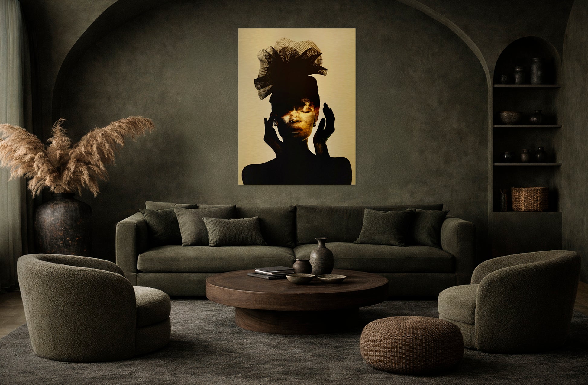 Printed on gold metal, the contrast between darkness and light becomes striking and symbolic. The surface amplifies depth and authority, allowing the work to command space with calm confidence.