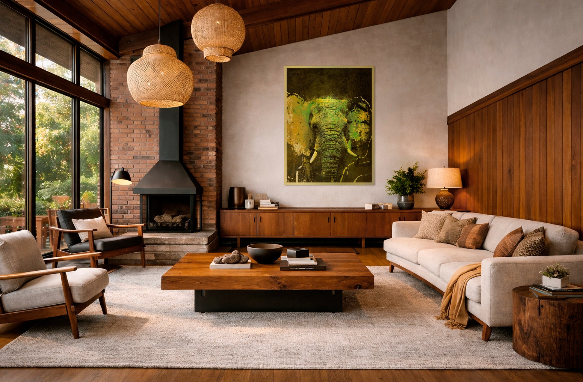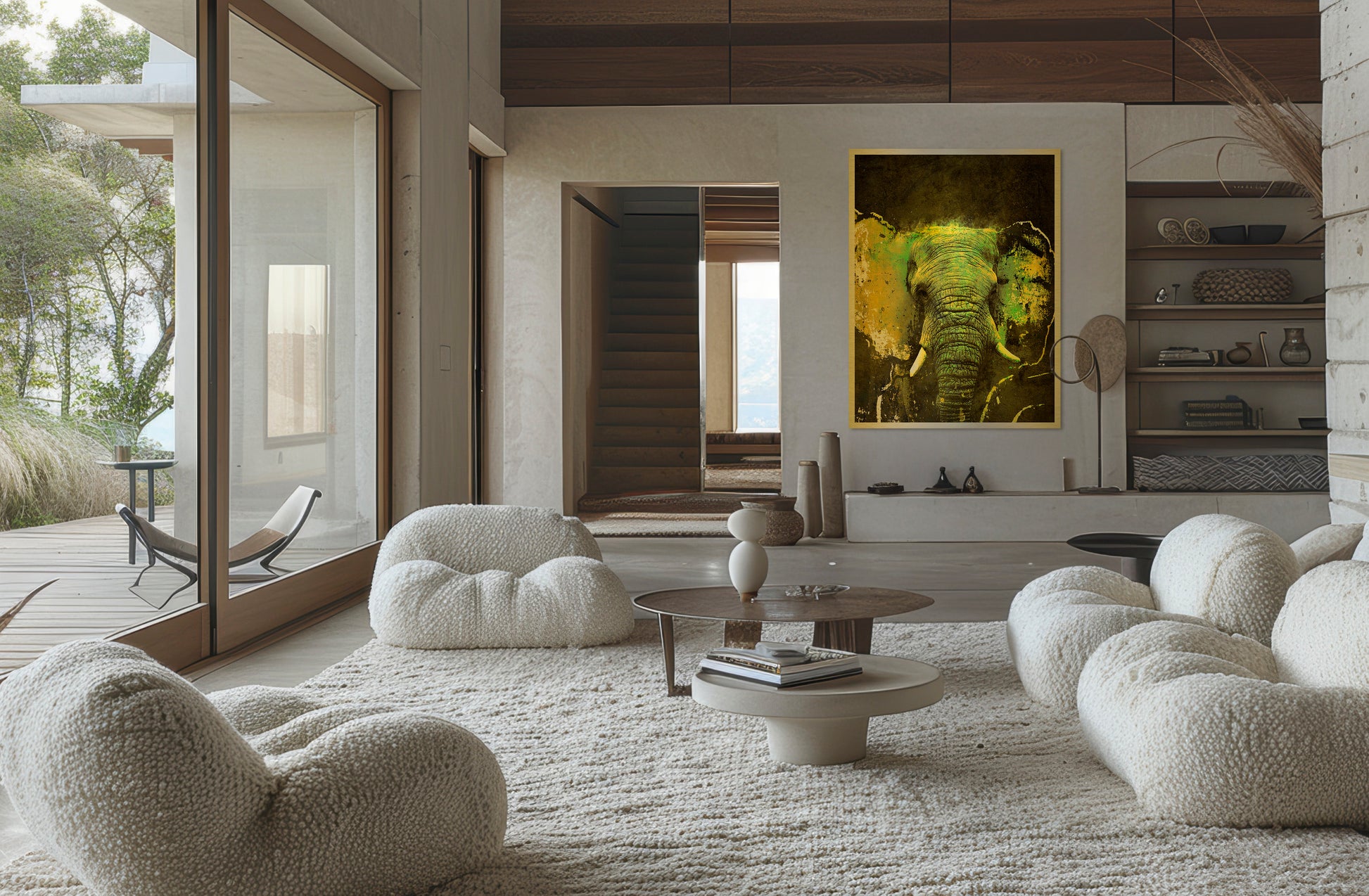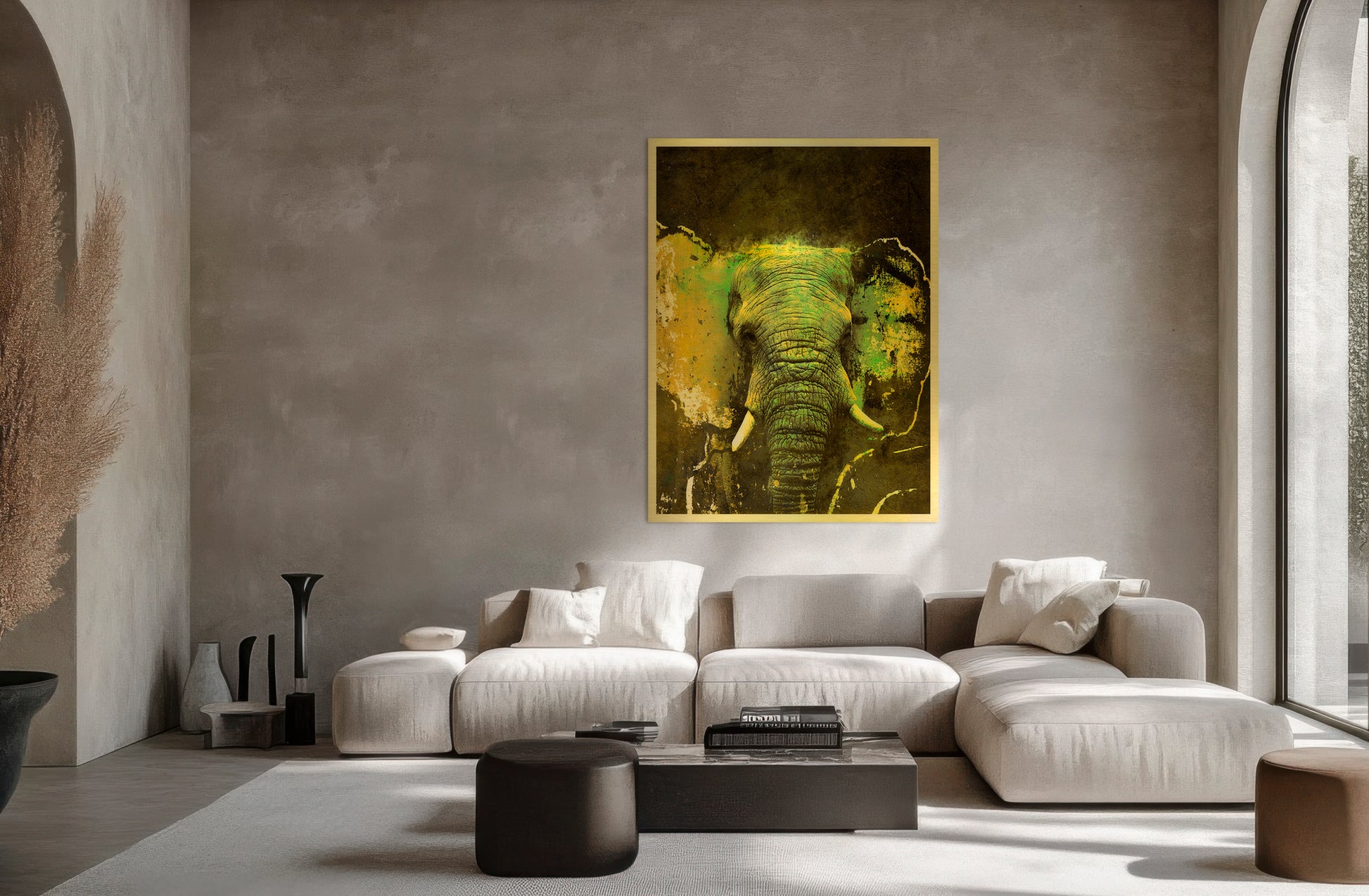 The layered greens and golds bring the elephant forward with depth and intensity — alive, confident, unwavering.