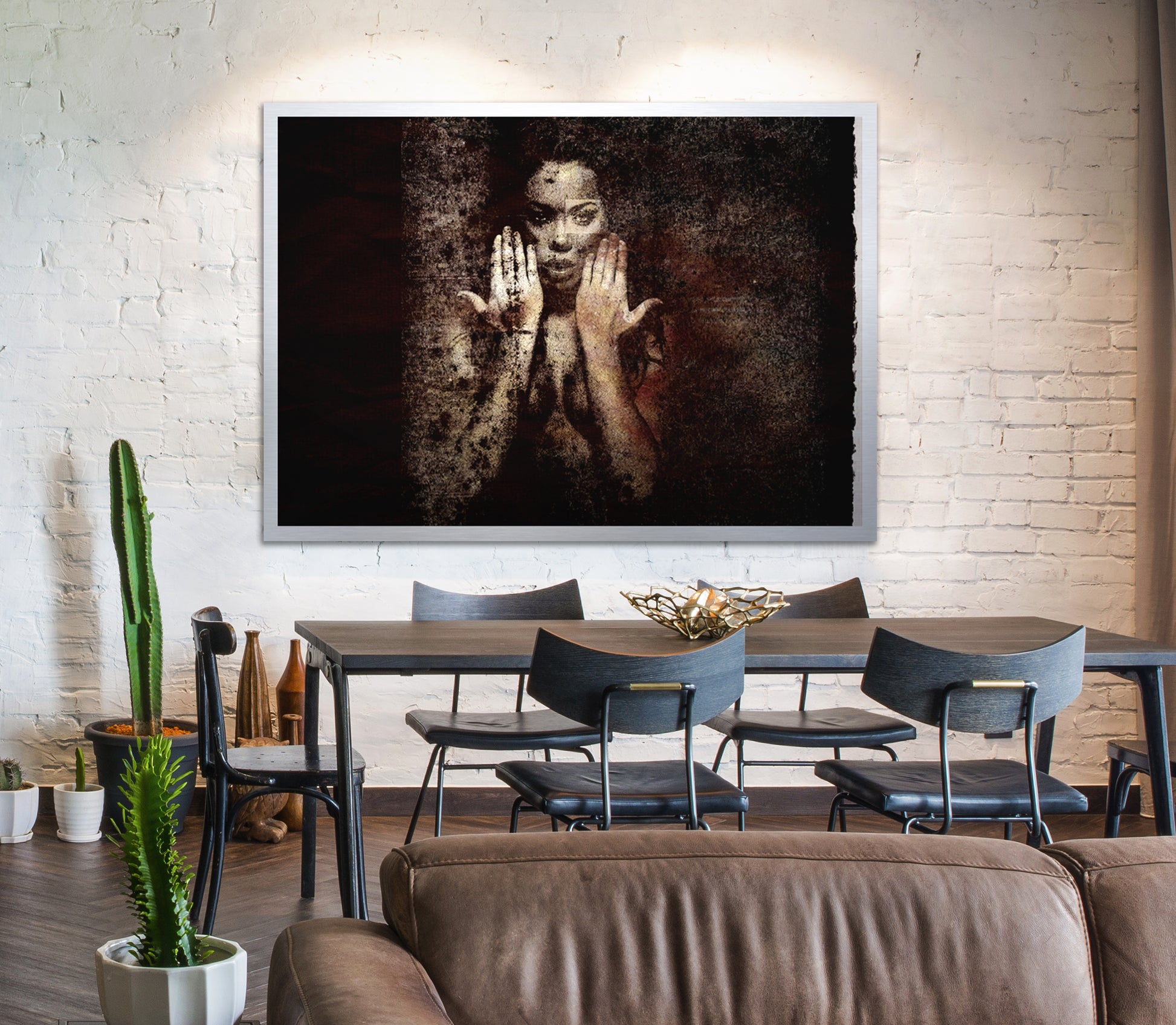 On the back of the art piece, we attach a sub-frame that makes it appear as if it’s floating 20 mm away from the wall.