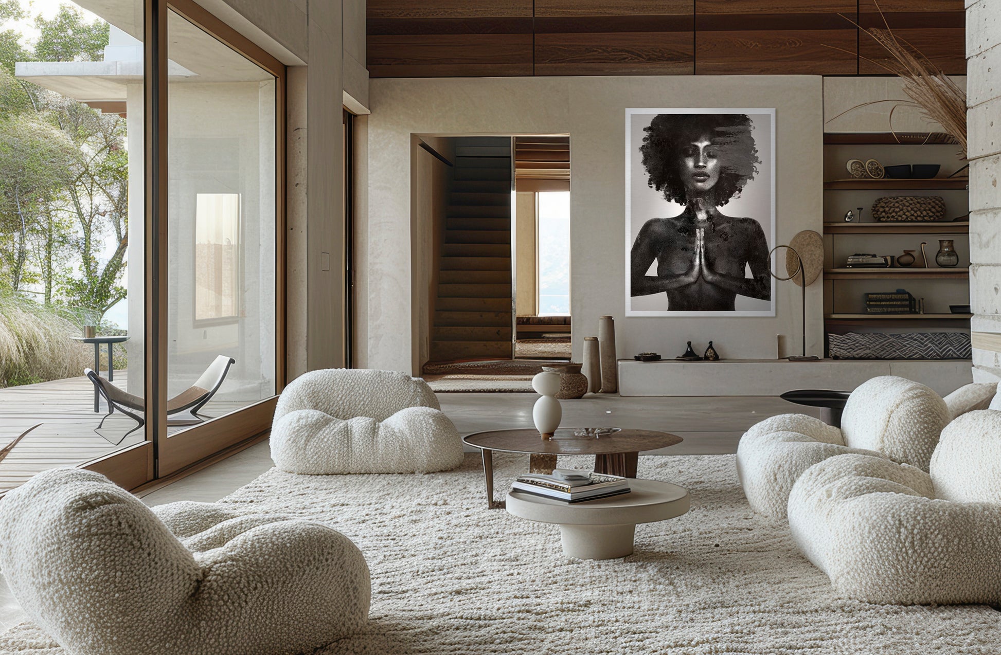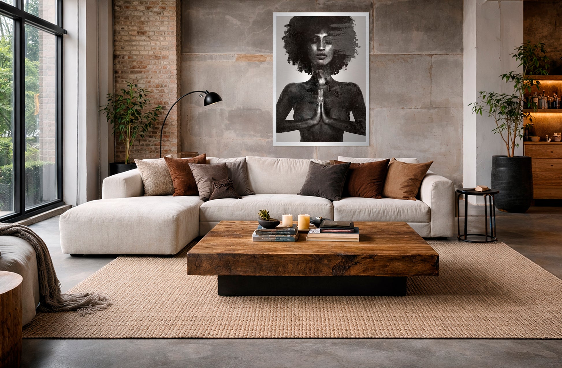 A concealed sub-frame is mounted on the back of the artwork, creating a floating effect approximately 20 mm from the wall.