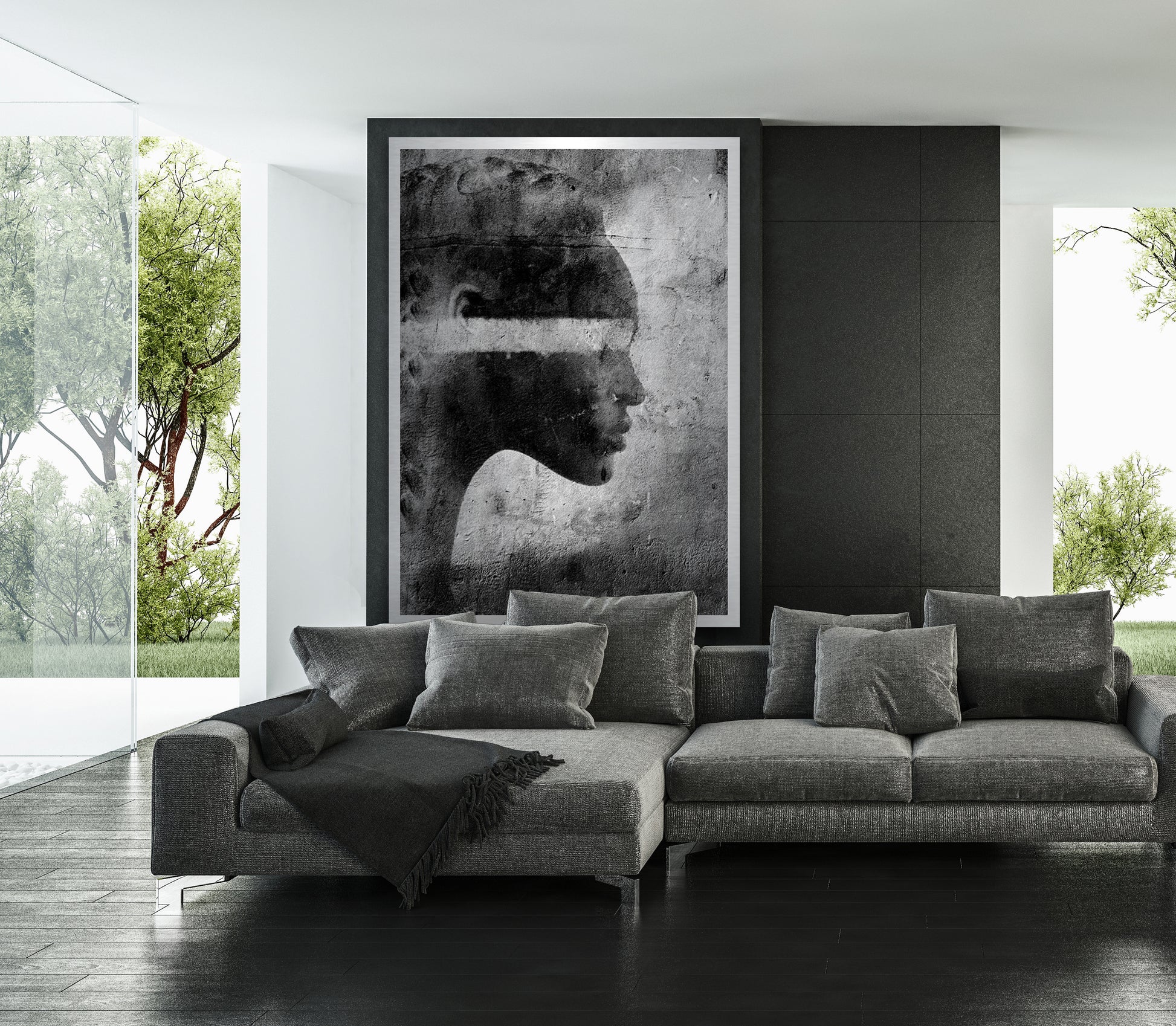 On the back of the art piece, we attach a sub-frame that makes it appear as if it’s floating 20 mm away from the wall.