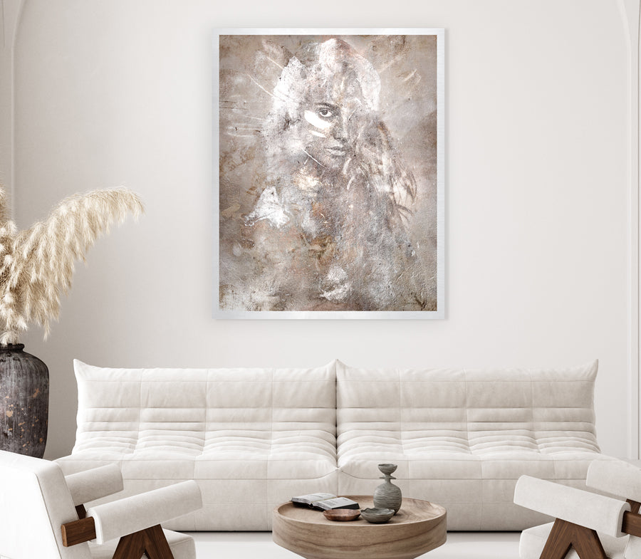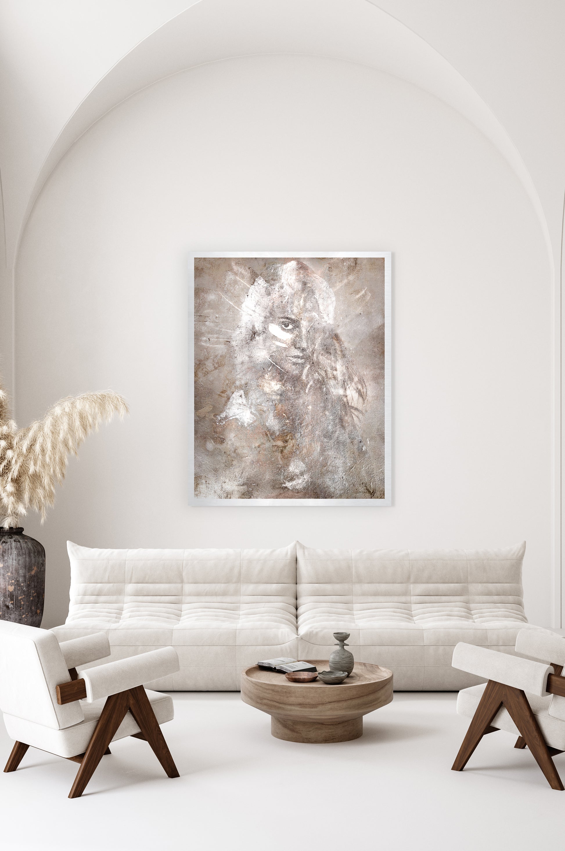 A gentle warrior woman whose visage mirrors strength veiled in softness. Her essence, a fusion of rugged concrete textures and delicate flower imprints, narrates the harmony found within contrasts